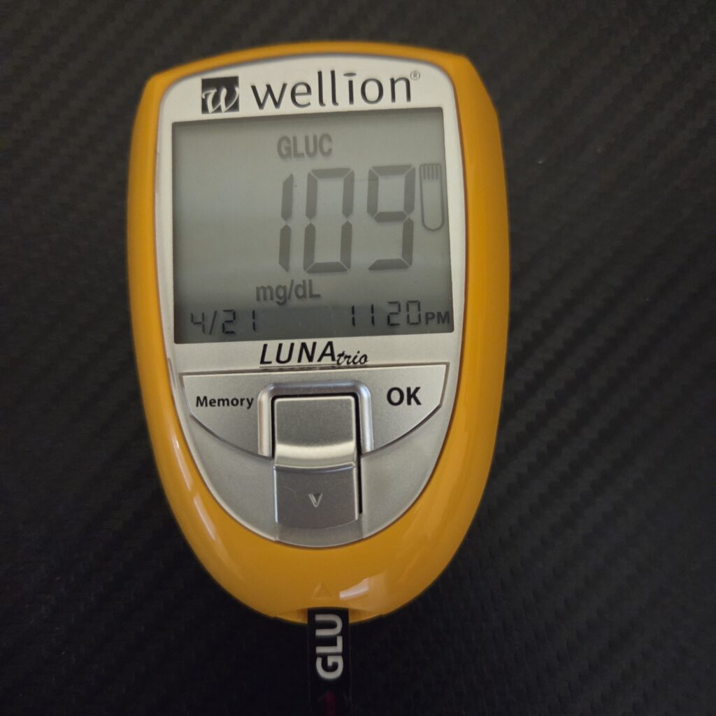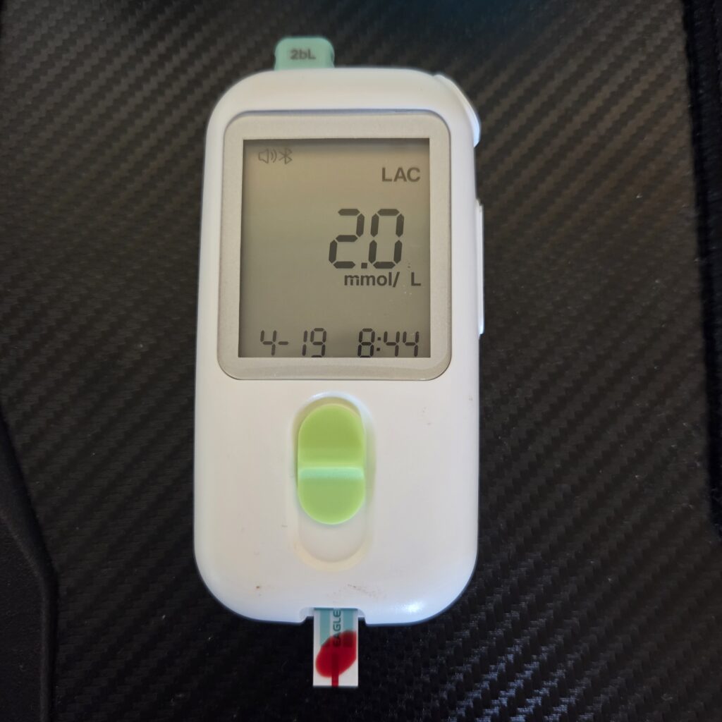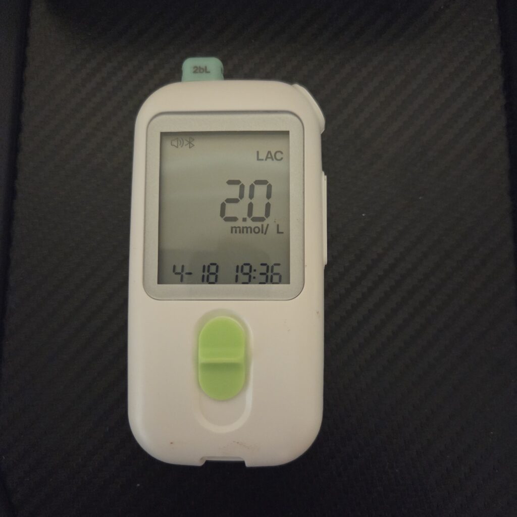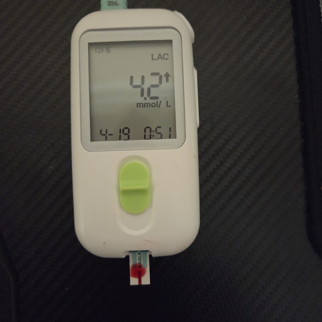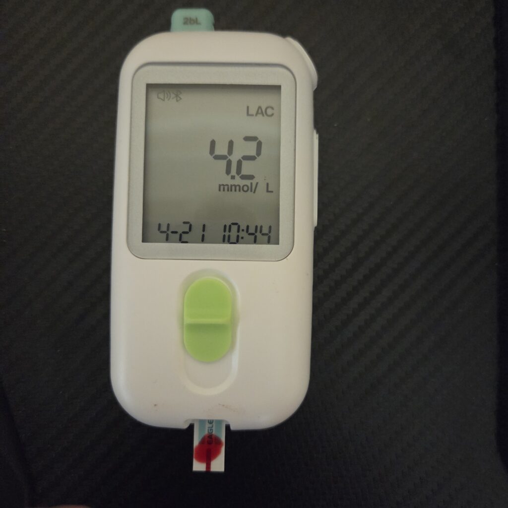 Después de todo esto acabo de medir el lactato porque creía que lo tenía por debajo de dos y sorpresa. Sin hacer ejercicio y descansando y con tres cigarros de una medición a otra, me sale 4.2 mmol/L, pero estaba peor con 2.0 mmol/L que con 4.2 mmol/L y puede ser debido a este lactato toda la noche, pero no tengo mediciones de ayer.