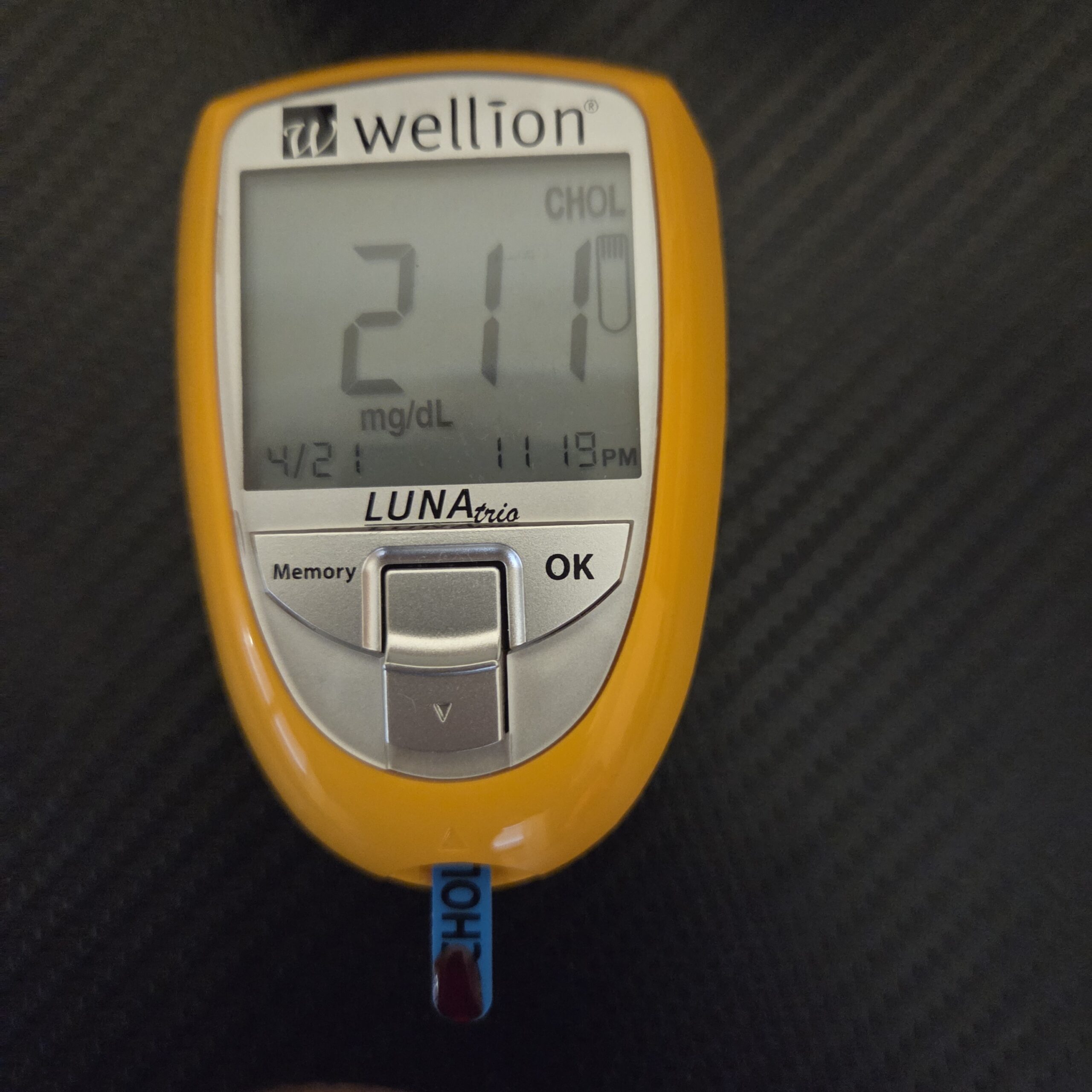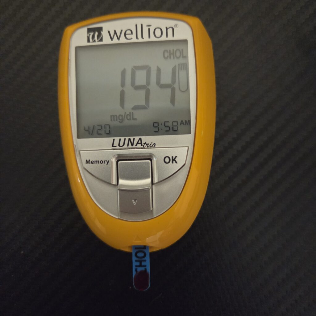 Hice esta medición de colesterol ahora y está en 194 mg/dL y ahora creo que el lactato empieza a hacer daño, no lo haría con 140 mg/dL, pero con esta medida sí y el tejido adiposo, con la temperatura baja, puede indicar grasas en sangre.